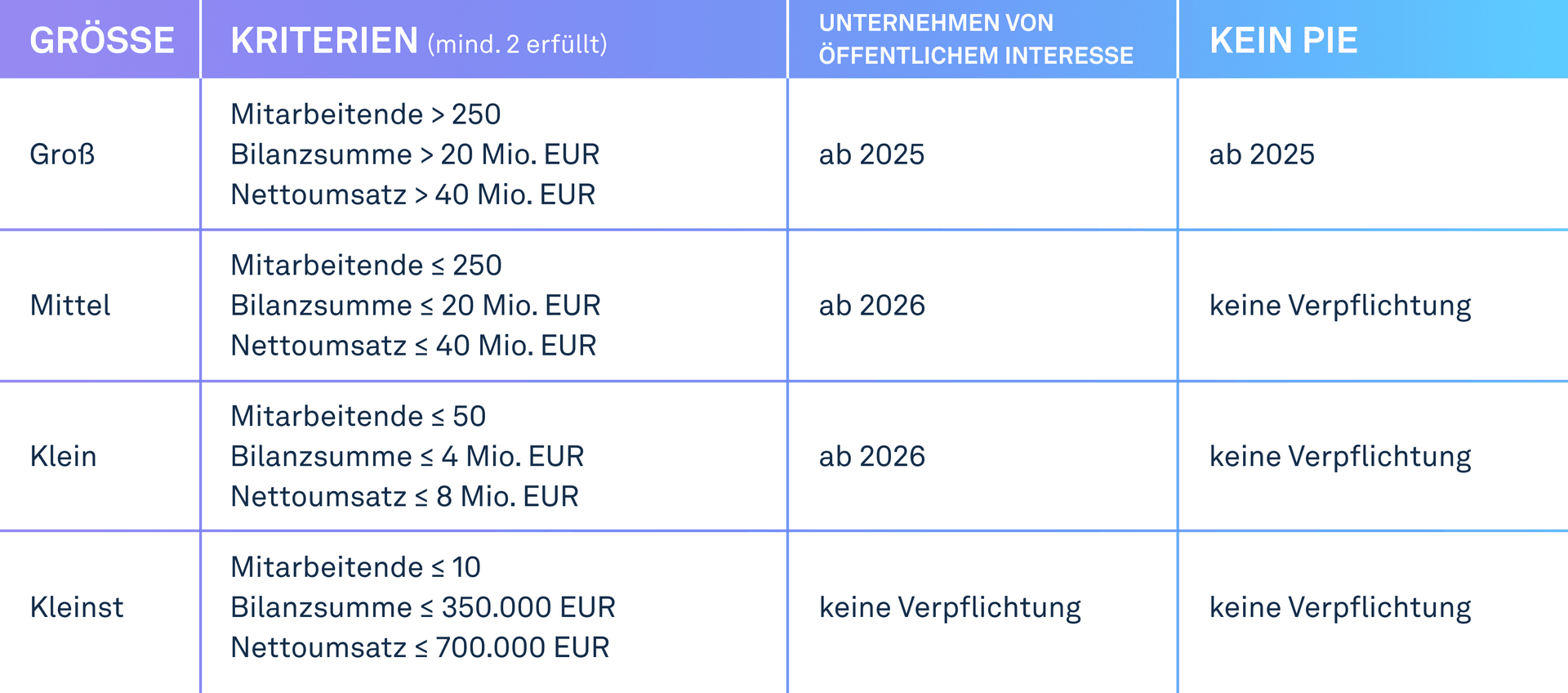 Als Erweiterungen werden mit der neuen Gesetzeslage nach dem CSRD darüber hinaus Unternehmen, die bisher nicht berichtspflichtig waren, verpflichtet. Das schließt große Unternehmen ein, die an einem EU-regulierten Markt notiert sind, sowie nicht börsennotierte mittelgroße und kleine Unternehmen von öffentlichem Interesse, die bestimmte Größenmerkmale überschreiten (siehe untere Tabelle). Ausgenommen von der Regelung sind kleine und mittlere Unternehmen, vorausgesetzt sie sind keine Unternehmen des öffentlichen Interesses. Gänzlich ausgeschlossen von der Regelung sind nur Kleinstunternehmen.